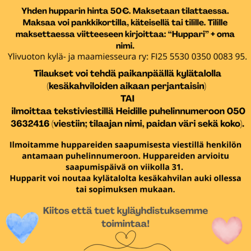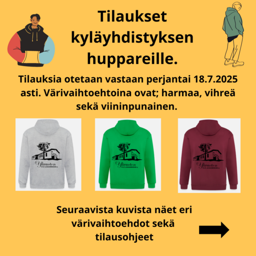 Tilaukset kyläyhdistyksen huppareille. Tilauksia otetaan vastaan 18.7.2025 asti. (Lisätietoa sekä tilausohjeet alla olevissa kuvissa)